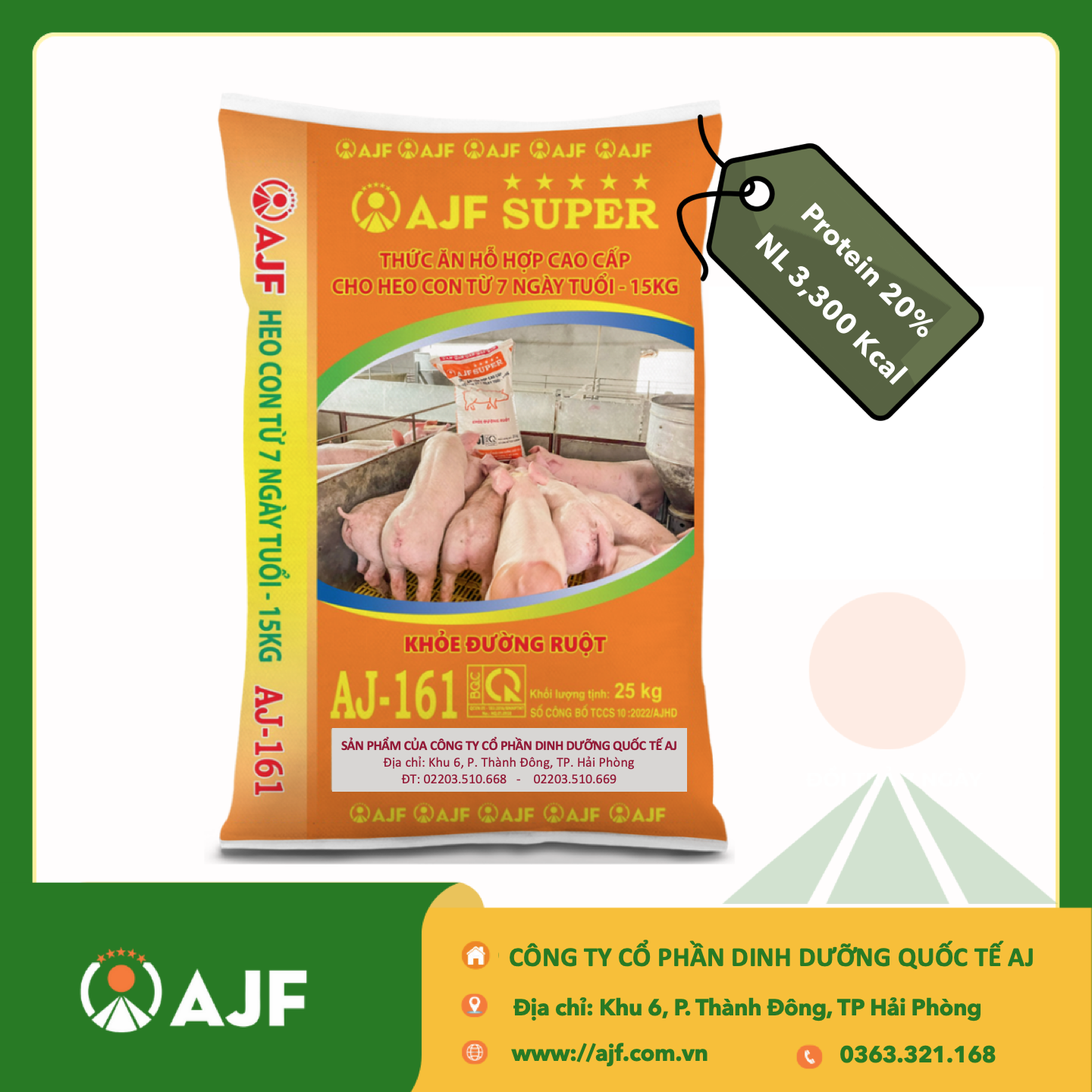 Giai đoạn từ 7 ngày tuổi đến 15 kg là thời điểm quan trọng để heo con chuyển từ bú sữa mẹ sang ăn thức ăn rắn. AJ161, sản phẩm thức ăn hỗn hợp cao cấp dạng viên (kích thước 2.5 mm), được nghiên cứu và sản xuất với công nghệ tiên tiến, mang đến giải pháp dinh dưỡng tối ưu, giúp heo con dễ dàng làm quen với thức ăn mới, tăng trưởng ổn định và có hệ tiêu hóa khỏe mạnh.